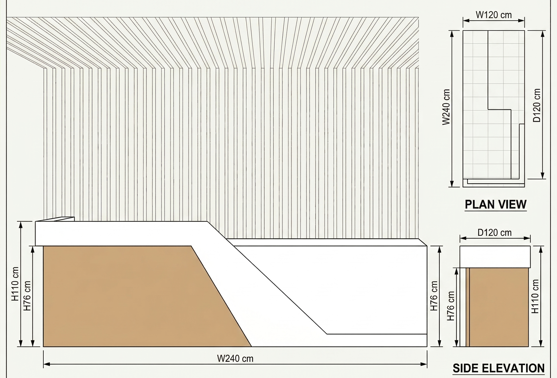اترك انطباعًا أوليًا لا يُنسى مع طاولة الاستقبال الفاخرة ذات اللمسة الرخامية. صُممت للمكاتب الراقية وصالات العرض الفاخرة، إذ تجمع بين الدفء الطبيعي للخشب وأناقة نسيج الرخام الأبيض الأنيق. مبنية باستخدام أسطح كاستامونو العالمية وخشب رقائقي عالي المتانة، لتتحمل الاستخدام اليومي المكثف مع الحفاظ على جماليتها الراقية. يوفر التصميم ثنائي المنطقة توازنًا مثاليًا بين التفاعل مع الضيوف وإنتاجية الموظفين.