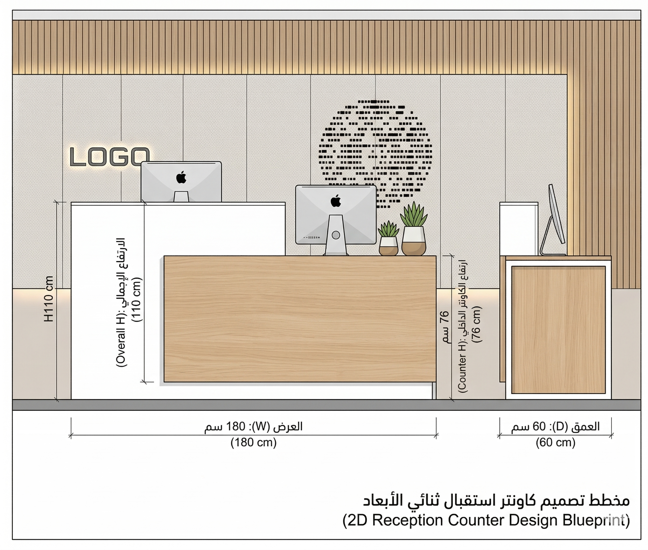 تعدد مستويات الخدمة: يضم مستوى علوي لاستقبال العملاء ومساحة سفلية مريحة ومنظمة لموظف الاستقبال.
