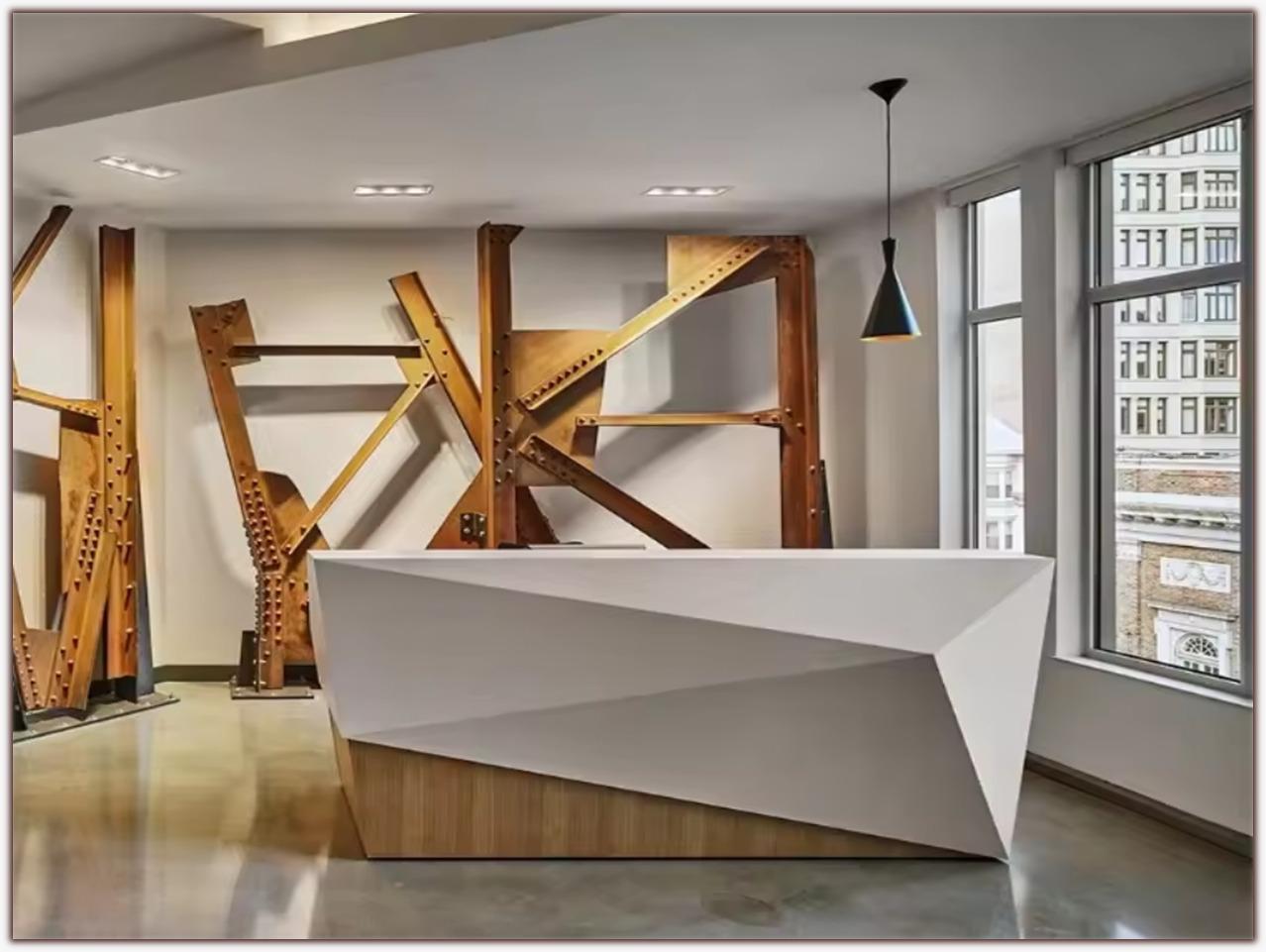 مكاتب الاستقبالتصميم هجين فريد: يجمع بين الواجهة الهندسية الدياموند باللون الأبيض والقاعدة الخشبية الطبيعية بأسلوب عصري.