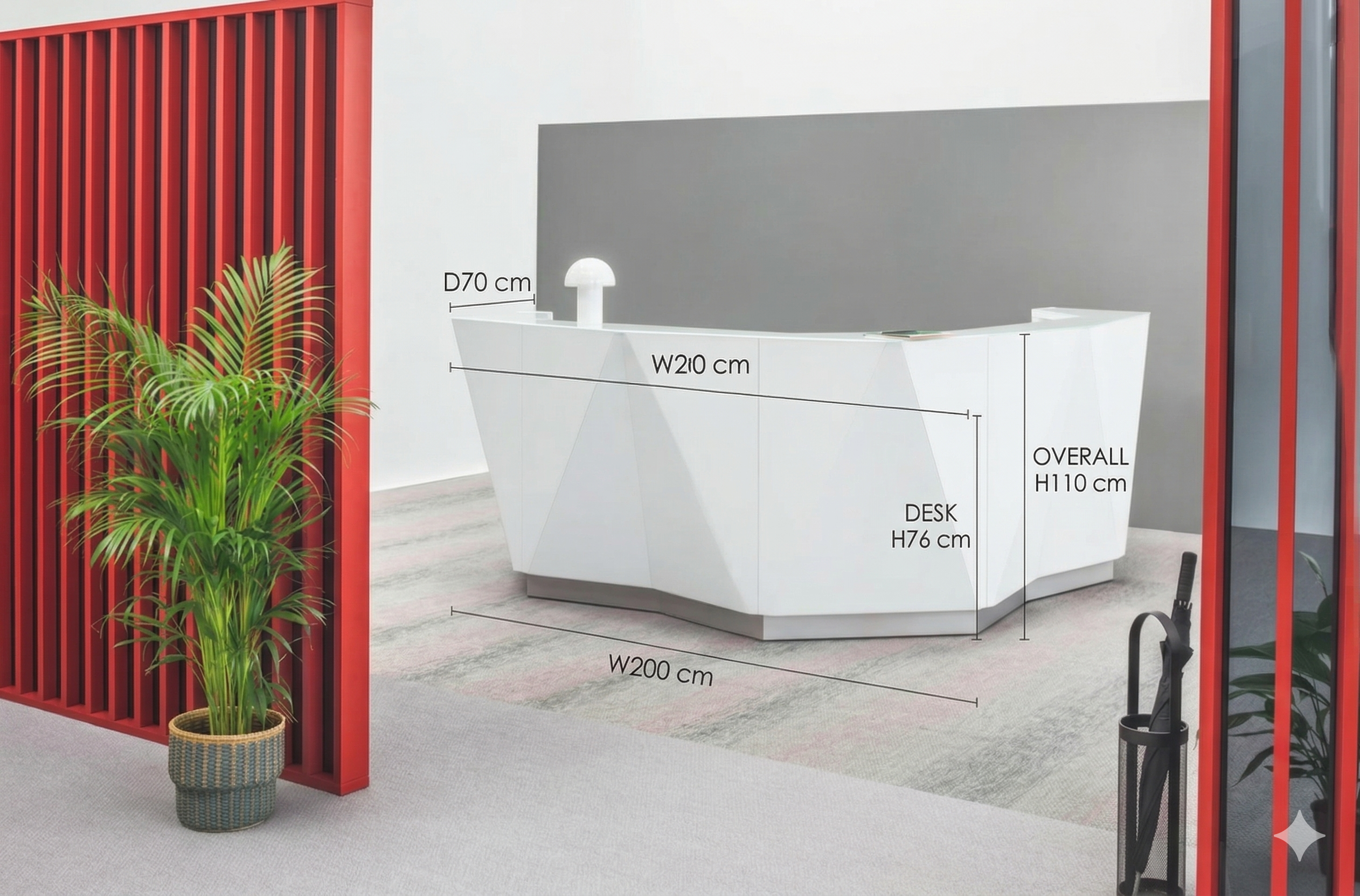 أعِد تعريف الرقي مع مكتب الاستقبال "أورا ويلكام". يتميز هذا المكتب بقطع معماري قطري درامي يفصل بين سطح من الرخام الأبيض الناصع وقاعدة من الخشب الصلب. صُنع باستخدام أسطح كاستامونو عالية الضغط وإطار هيكلي من الخشب الرقائقي لضمان المتانة طويلة الأمد في ردهات الاستقبال ذات الحركة الكثيفة. يُضفي ضوء LED المدمج على طول القطع المائل لمسة مستقبلية تُبرز التصميم الفريد للمكتب — مثالي للمكاتب الفاخرة وصالات العرض الراقية.